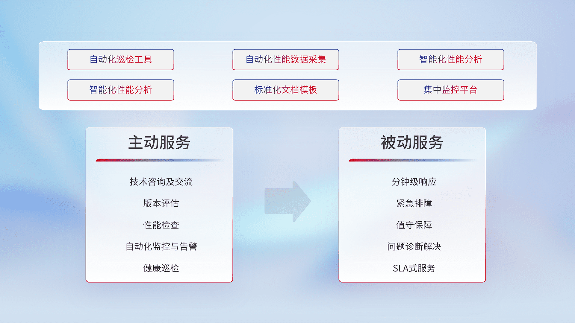 智能化工具和标准化文档,,,保障服务质量,,提供主动服务(包含技术咨询、、版本评估、、性能检查、、、、自动化监控与告警、、健康巡检)和被动服务包含(分钟级响应、、、紧急排障、、值守保障、、、、问题诊断解决、、SLA服务)。。